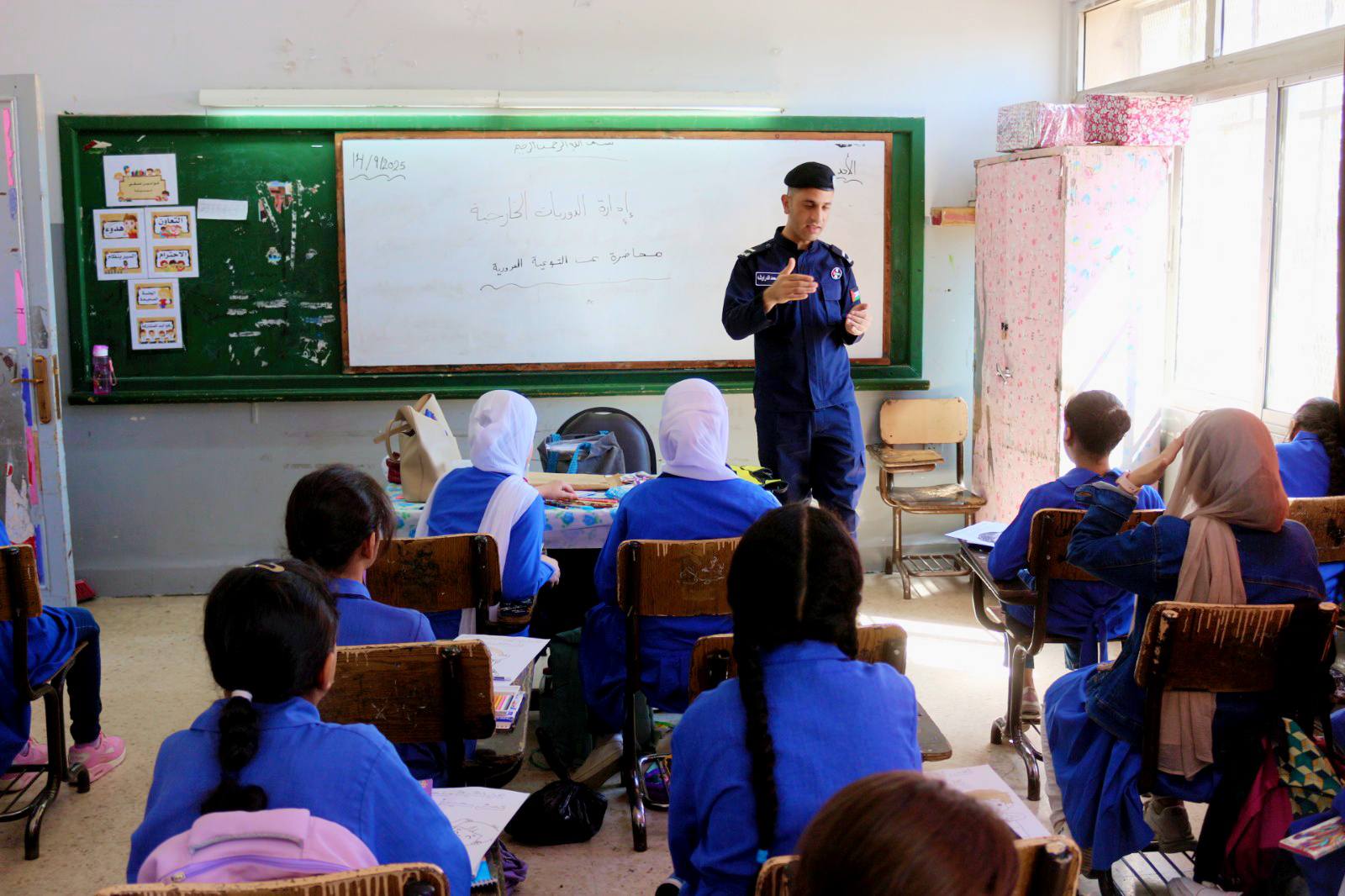 جو أكاديمي - نظمت إدارة الدوريات الخارجية بالتعاون مع الشرطة المجتمعية في مدرسة أم الحيران الاساسية المختلطة التابعة لمديرية التربية والتعليم للواء القويسمة محاضرة عن السلامة المرورية.