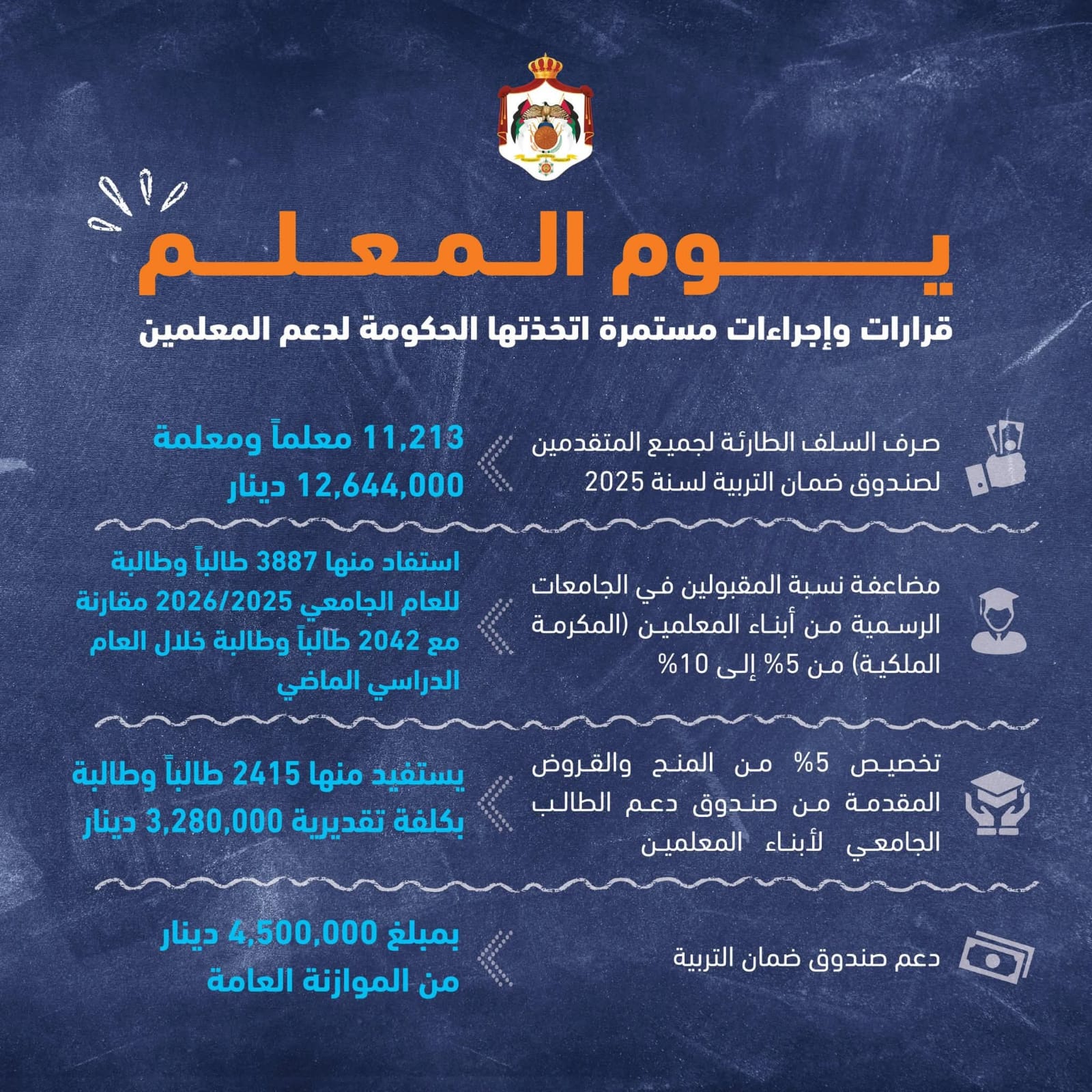 وأشارت إلى صرف السلف الطارئة لجميع المعلمين المتقدمين لصندوق ضمان التربية لسنة 2025، والبالغ عددهم 11213 معلما، بمبلغ إجمالي حوالي 12.644 مليون دينار، ومضاعفة نسبة المقبولين في الجامعات الرسمية من أبناء وبنات المعلمين من 5 بالمئة إلى 10 بالمئة، إذ استفاد منها 3887 طالبا وطالبة للعام الجامعي 2025 /2026، مقارنة بـ 2042 طالبا في العام الدراسي الماضي.